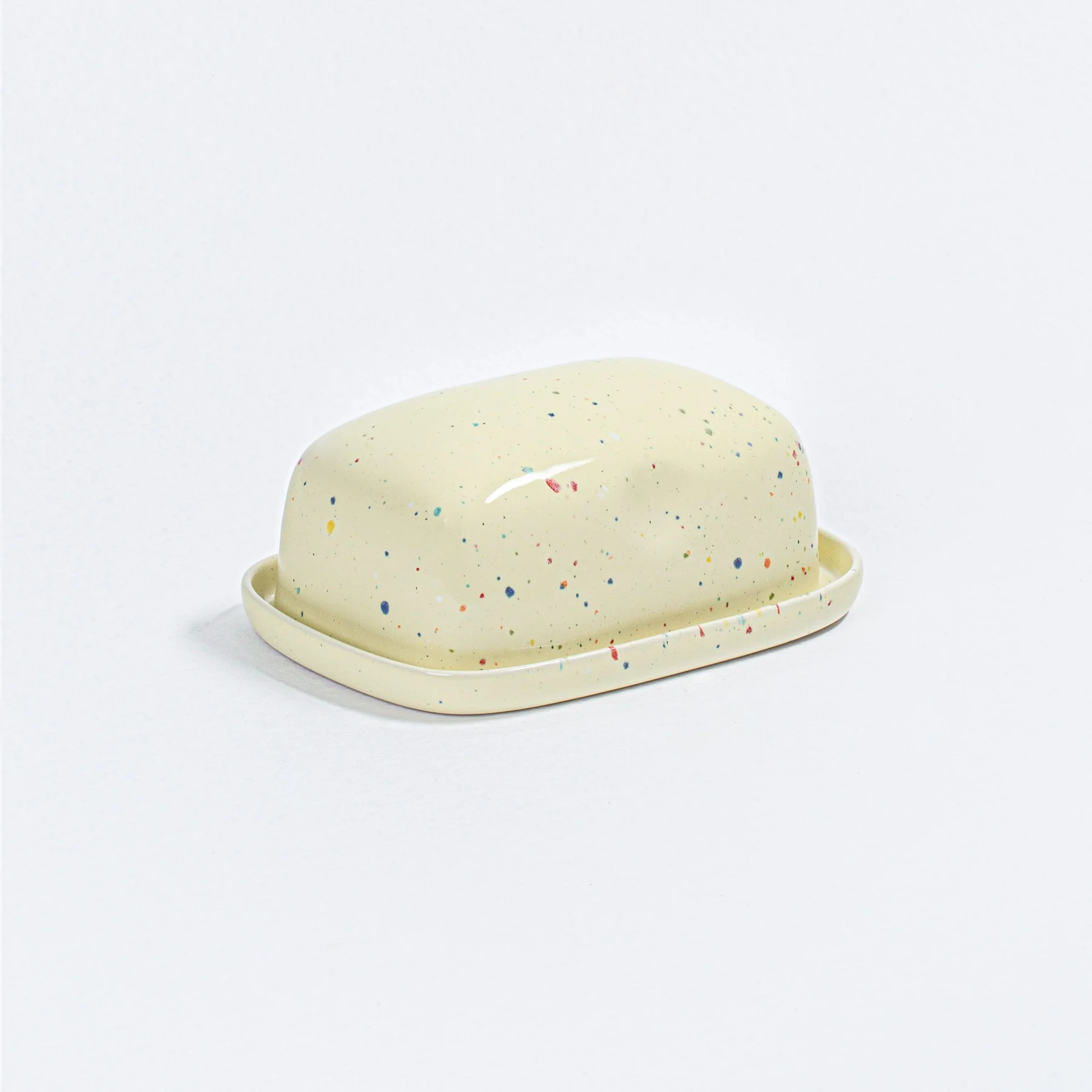 Voici un grand beurrier en céramique pour vos tablettes de 500gr de beurre. Il va transformer votre table ordinaire en toile extraordinaire avec ses détails mouchetés Jaune! Ici on jour ton sur ton !
