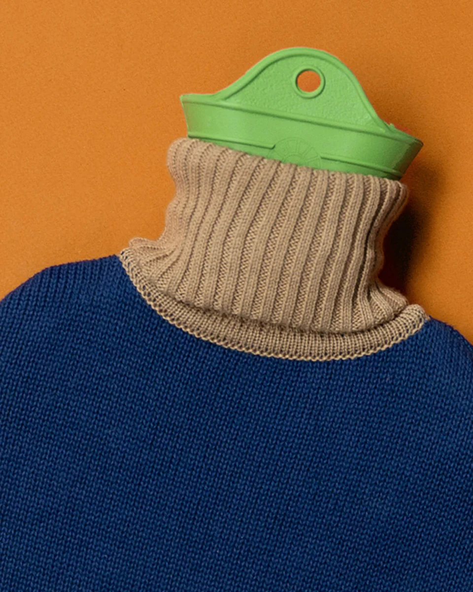 Cette bouillotte déhoussable bleu marine est conçue en caoutchouc naturel. Sa housse tricotée est en coton biologique. Elle est merveilleusement douce et ne démange pas pour vous accompagner hiver comme été.