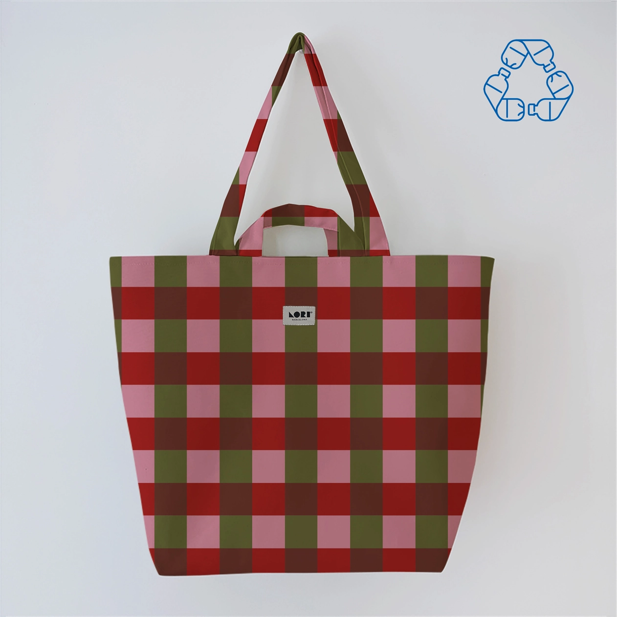 Vous allez adorer ce cabas imperméable et recyclé au design géométrique et coloré fabriqué à Barcelone. De la plage aux événements les plus chics, aux courses, ce sac est votre compagnon polyvalent. Ce sac fourre-tout est fabriqué en tissu recyclé à partir de bouteilles en plastique. Celui-ci à une touche automnale avec ces couleurs vertes et bordeaux.