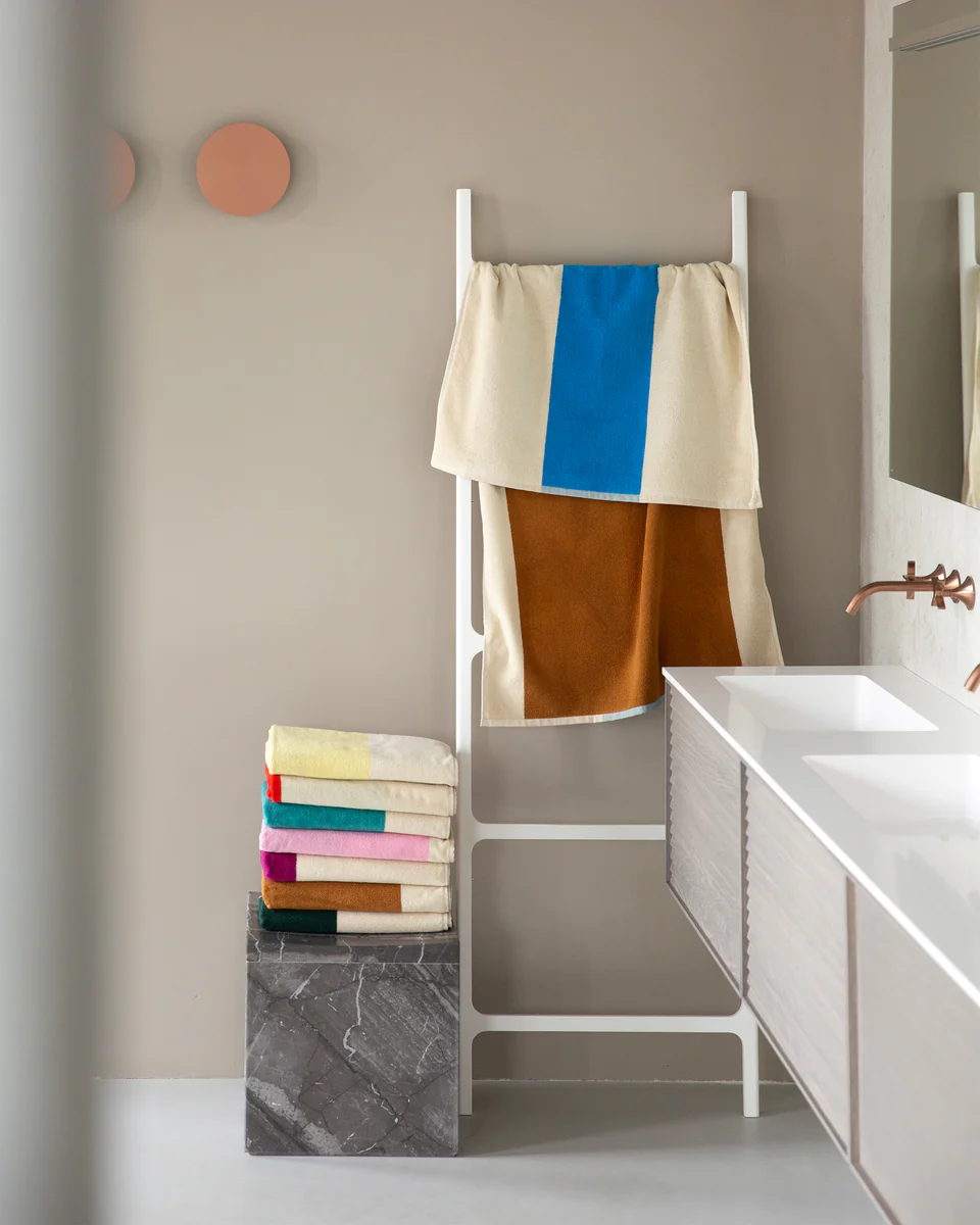 Des serviettes de bain en coton bio toute douces et pleines de couleurs! Cette collection de draps de bain est le résultat d’une collaboration avec Karel Martens et est basée sur le projet artistique « Colors on the Beach » réalisé au Havre. Karel Martens a repeint les cabines de plage de la ville, ce sont ces couleurs et formes qui ont ensuite inspirées ces serviettes de bain.